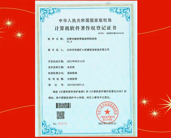 榮獲裝藥器生產(chǎn)控制平臺(tái)著作權(quán)登記證書(shū)